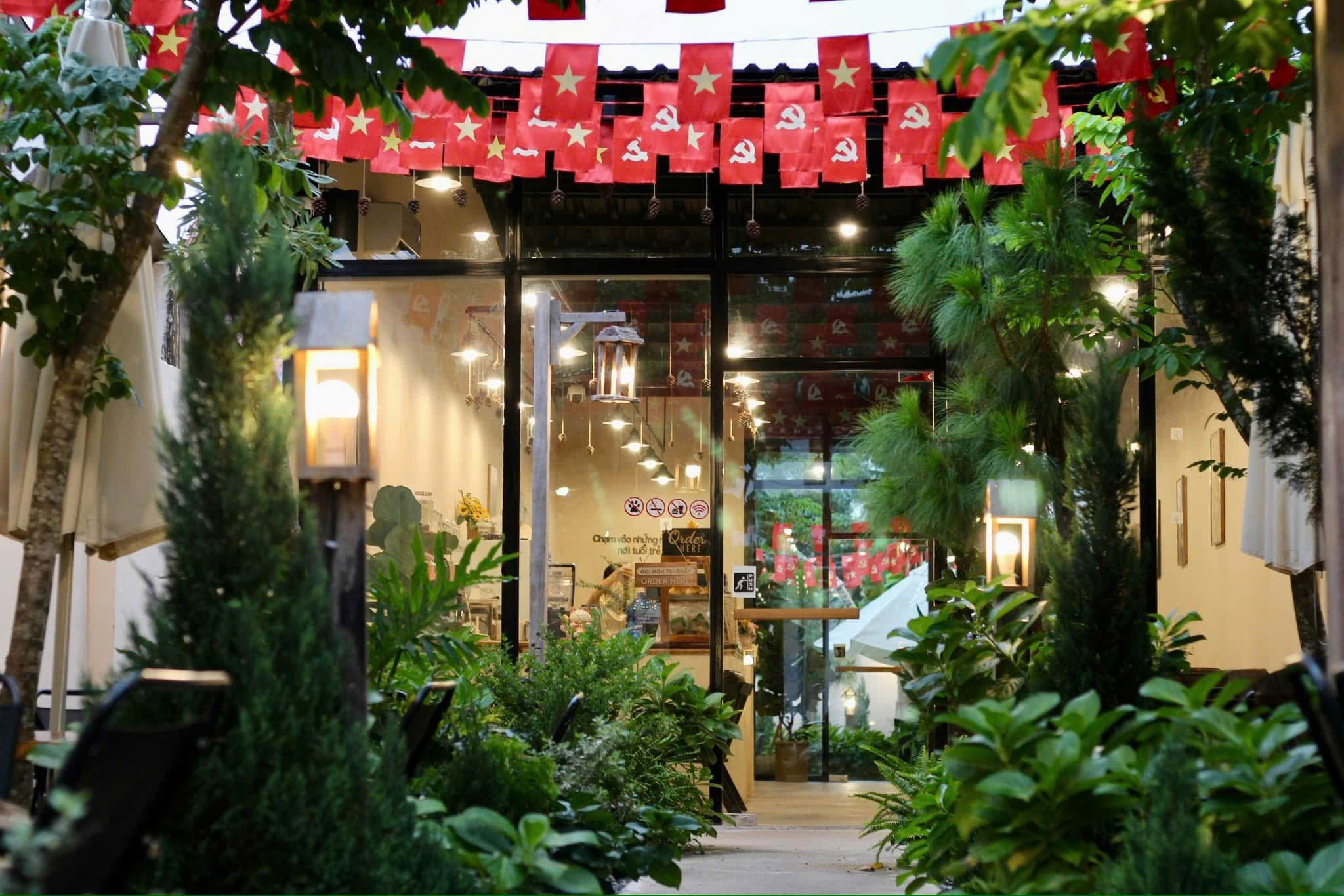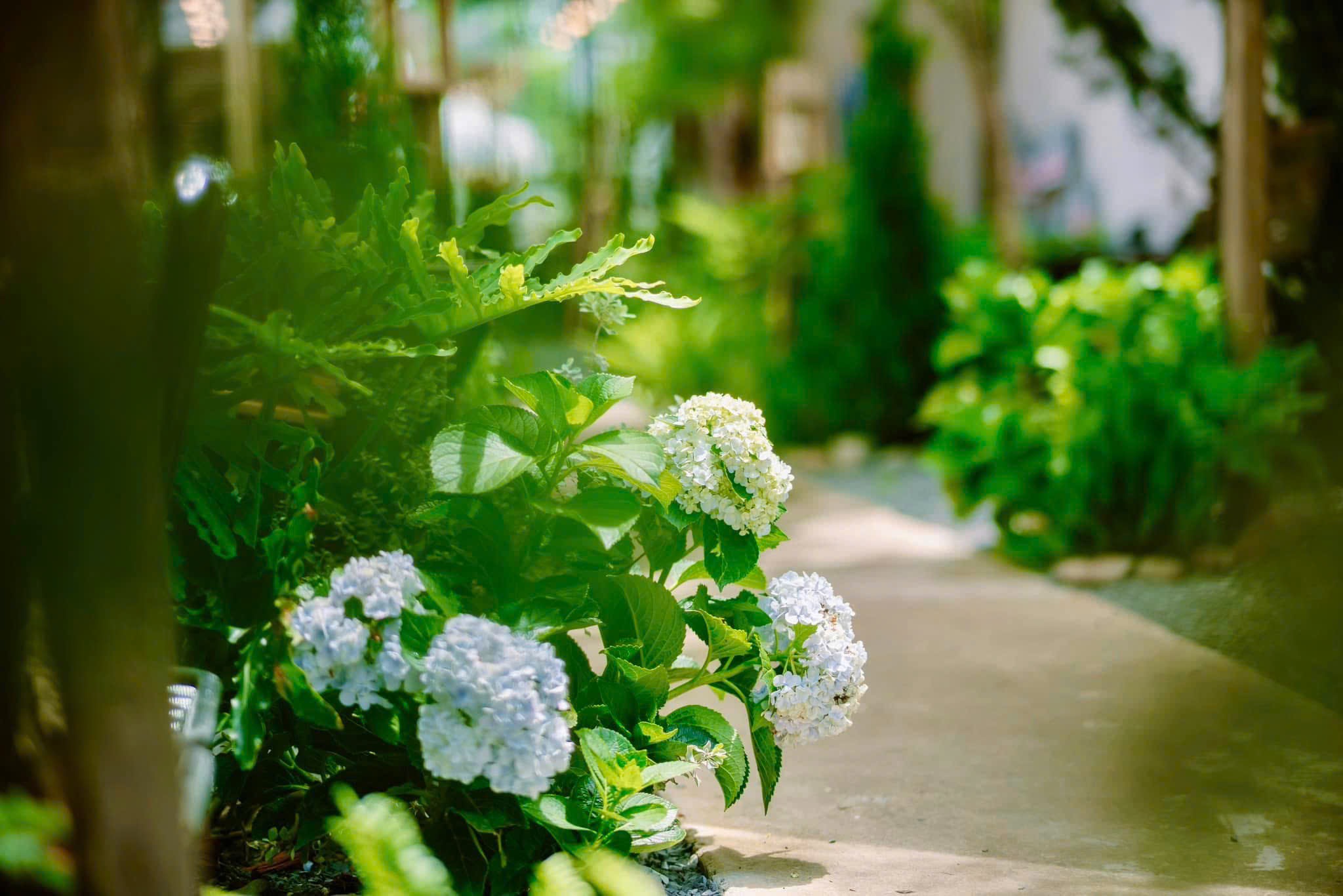 🌻Vườn hoa nhiều màu sắc: Xung quanh quán được tô điểm bằng sắc màu của cẩm tú cầu, sự kiêu sa của hoa hồng, và vẻ đáng yêu của những chậu sen đá nhỏ xinh.